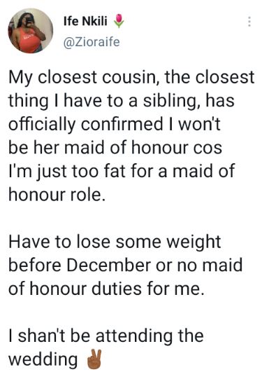 "My closest cousin, the closest thing I have to a sibling, has officially confirmed I won't be her maid of honour cos I'm just too fat for a maid of honour role. Have to lose some weight before December or no maid of honour duties for me. I shan't be attending the wedding" she tweeted on Sunday, June 5.