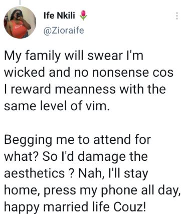 "My family will swear I'm wicked and no nonsense cos I reward meanness with the same level of vim. Begging me to attend for what? So I'd damage the aesthetics ? Nah, I'll stay home, press my phone all day, happy married life Couz!"