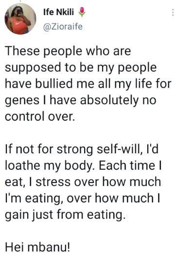 "These people who are supposed to be my people have bullied me all my life for genes I have absolutely no control over. If not for strong self-will, I'd loathe my body. Each time I eat, I stress over how much I'm eating, over how much I gain just from eating. Hei mbanu!" she added.