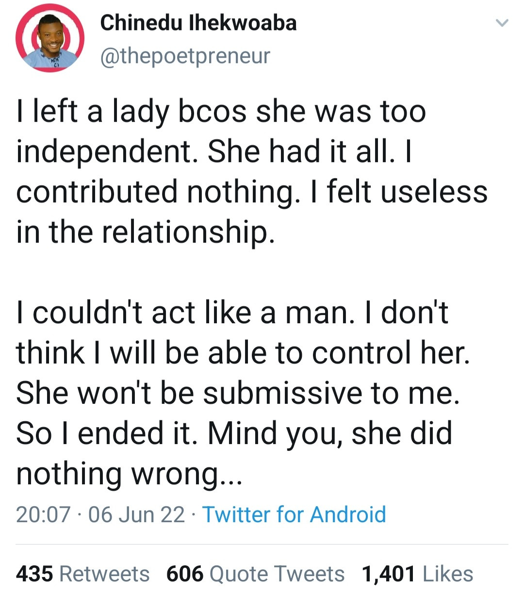 Chinedu Ihekwoaba in a tweet revealed that the lady was too independent and had it all.