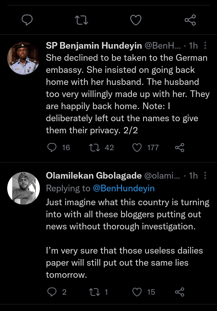 She declined to be taken to the German embassy. She insisted on going back home with her husband. The husband too very willingly made up with her. They are happily back home. Note: I deliberately left out the names to give them their privacy.