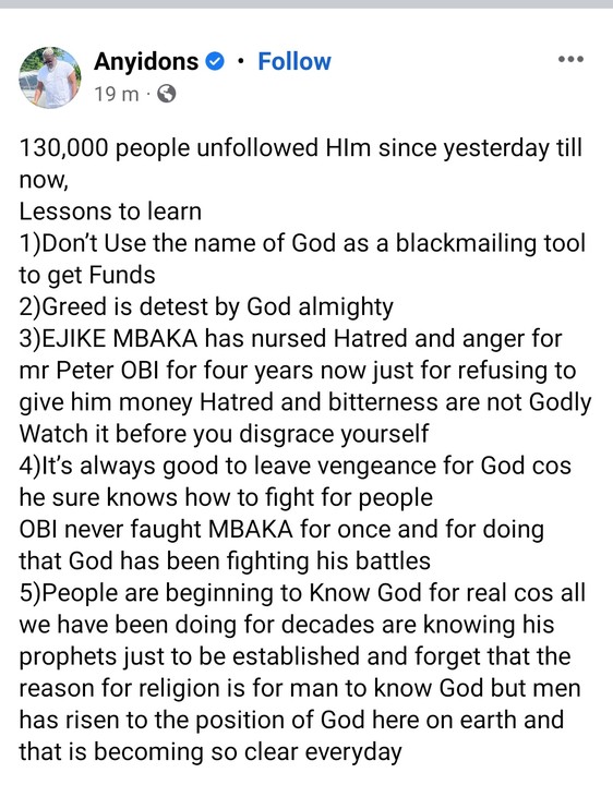 Following his recent outburst against Labour Party presidential candidate, Peter Obi, the Spiritual Director of the Adoration Ministry Enugu, Rev Father Ejike Mbaka has suffered a huge loss on social media.