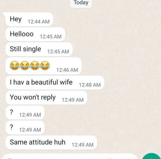 He gloated to her about having a beautiful wife and suggested that she was unmarried due to her attitude.