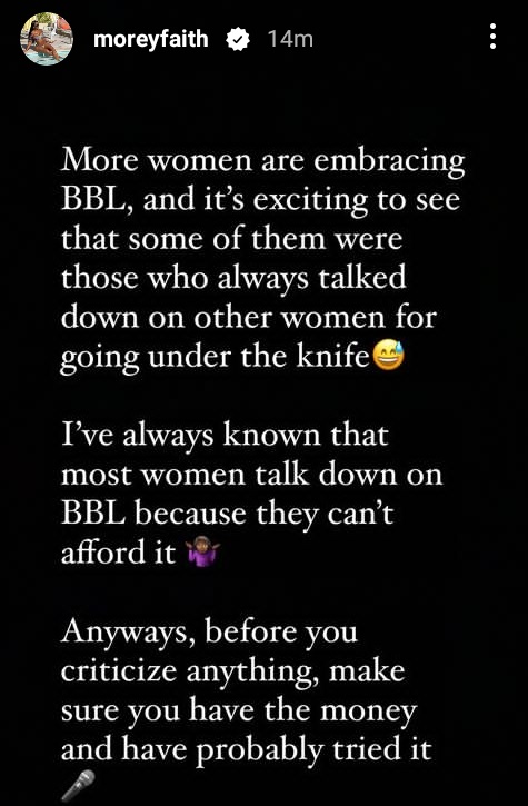 "I 've always known that most women talk down on BBL because they can't afford it. Anyways, before you criticise anything, make sure you have the money and have probably tried it. " she added.