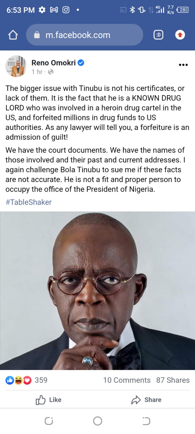 We have the court documents. We have the names of those involved and their past and current addresses. I again challenge Bola Tinubu to sue me if these facts are not accurate. He is not a fit and proper person to occupy the office of the President of Nigeria.