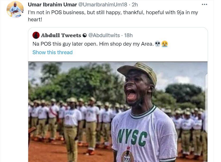 Countering the claim made on Twitter, @UmarIbrahimUm18 stated that he is still "happy, thankful and hopeful with 9ja in my heart".