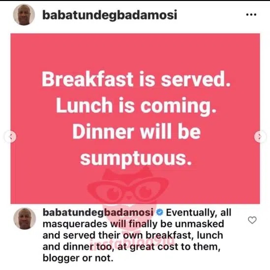 Eventually, all masquerades will finally be unmasked and served their own breakfast, lunch and dinner too, at great cost to them, blogger or not.”