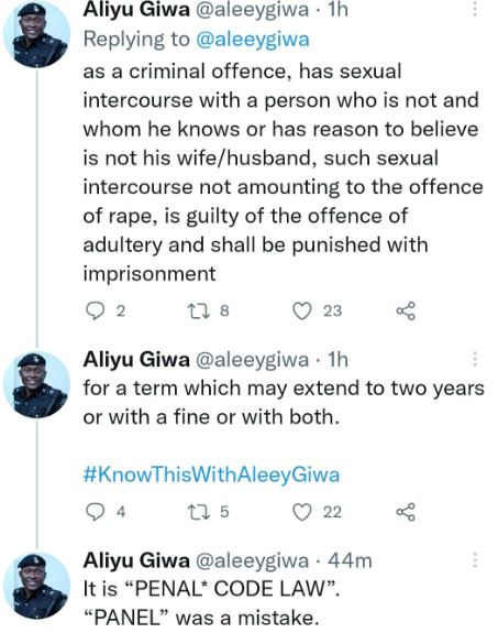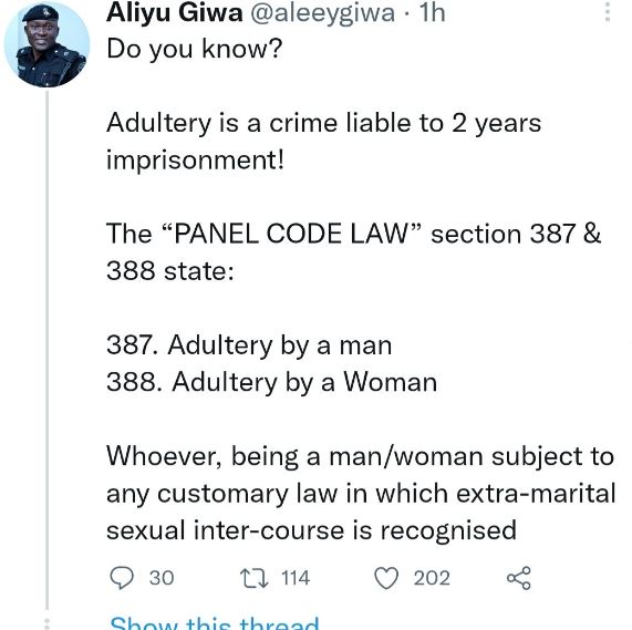 A former Lagos State Police PRO, Aliyu Giwa has taken to Twitter to warn that adultery is a criminal offense and attracts a punishment of 2 years imprisonment.