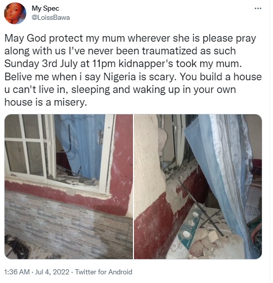 In a Twitter thread, the lady shared photos of their burgled home and stated that her mum was kidnapped at about 11pm on Sunday, July 3.
