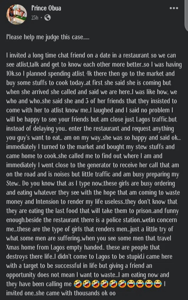 A man by name Prince Obua has narrated how he reacted after his female friend brought three of her friends to their date.