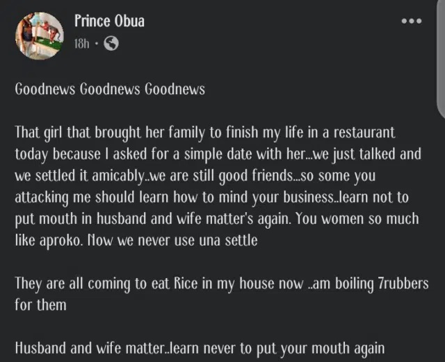 That girl that brought her family to finish my life in a restaurant today because I asked for a simple date with her…we just talked and we settled it amicably..we are still good friends…so some you attacking me should learn how to mind your business..learn not to put mouth in husband and wife matter’s again. You women so much like aproko. Now we never use una settle