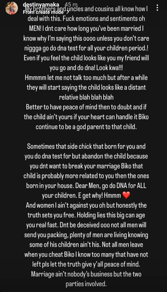 OAP Destiny Amaka has given men important advice to be on the safe side on issues involving DNA.