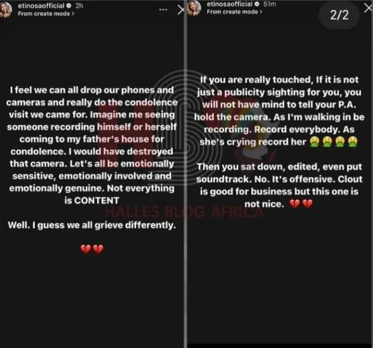Etinosa in the post shared on Instagram, said people need to drop their phones and cameras and engage in the condolence visit instead of clout chasing.