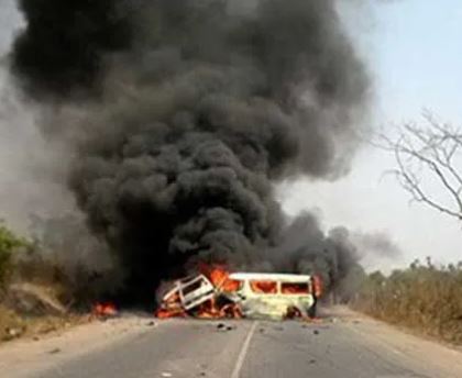The tyre of one of the vehicles burst and this led to a head-on collision which later resulted in a fire that burnt all occupants of the vehicles beyond recognition.