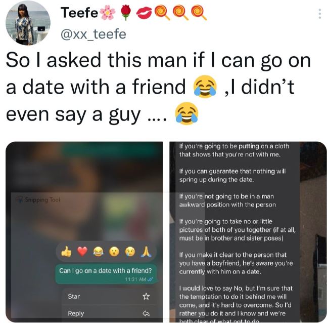 A woman has taken to Twitter to share the response she received from her boyfriend after she informed him she was going on a date.