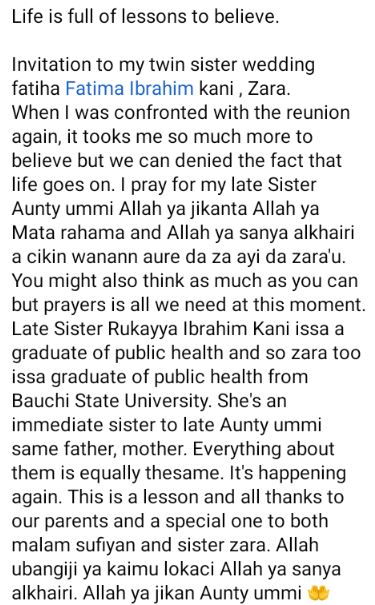 "Life is full of lessons to believe. Invitation to my twin sister wedding fatiha Fatima Ibrahim kani Zara," he wrote.