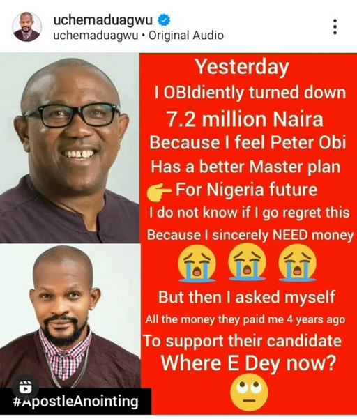 The thespian claimed that he was made an offer of 7.2 million naira to endorse another candidate for president other than his preferred candidate, Peter Obi, but he turned it down.