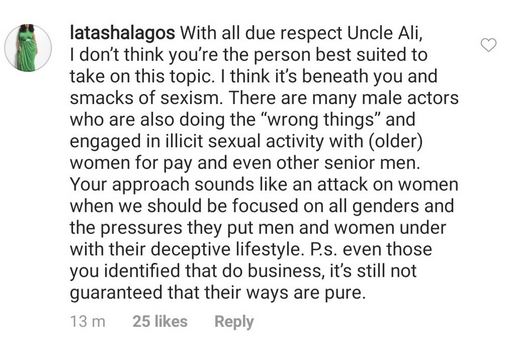Reacting to the video, Latasha said she felt his message is sexist and beneath him. She averred that his approach sounded like an attack on women.