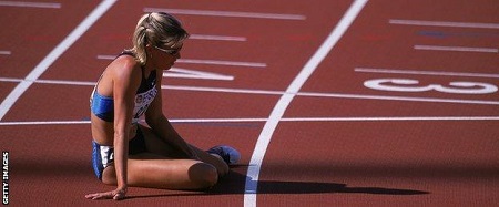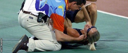 Hamilton is attended to after falling during the 1500m final at the Sydney Olympics, something she admits was intentional
