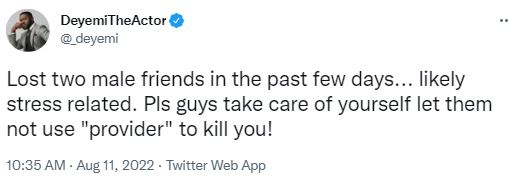 He said, “Lost two male friends in the past few days likely stress related. Please, guys take care of yourself, let them not use “provider” to kill you!”
