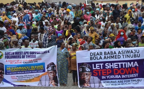 According to Punch, hundreds of stakeholders and party supporters of the ruling All Progressives Congress on Monday took to the streets of Lagos to protest the party’s stance on the contentious Muslim-Muslim ticket.