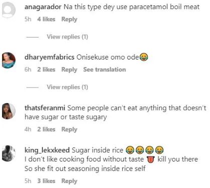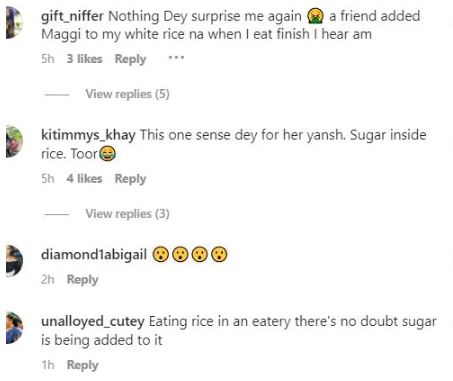 When a surprised Eloswag asked why she added sugar to rice, she noted that she doesn’t like cooking food without taste, so she made do with what was available.