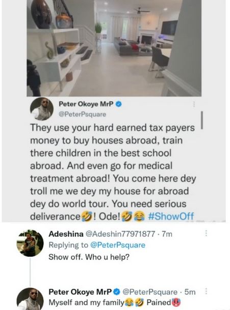 ''They use your hard earned tax payers money to buy houses abroad, train there children in the best school abroad. And even go for medical treatment abroad! You come here dey troll me we dey my house for abroad dey do world tour. You need serious deliverance! Ode!