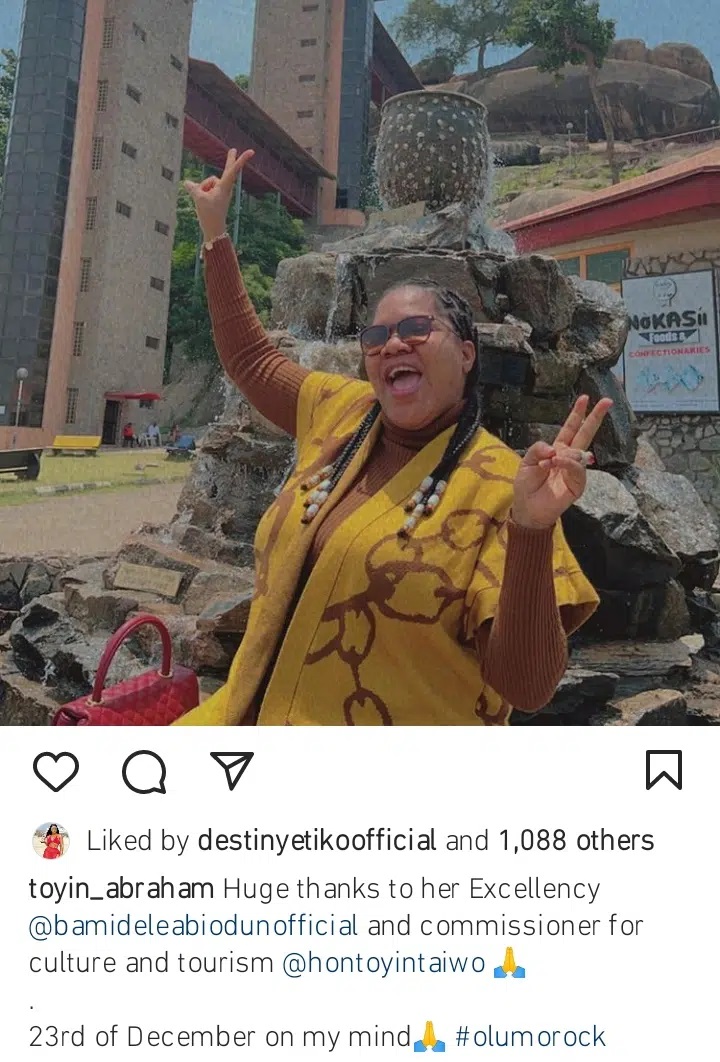 Sharing a photo of her at Oluomo Rock, Toyin revealed that she is anticipating December 23rd.