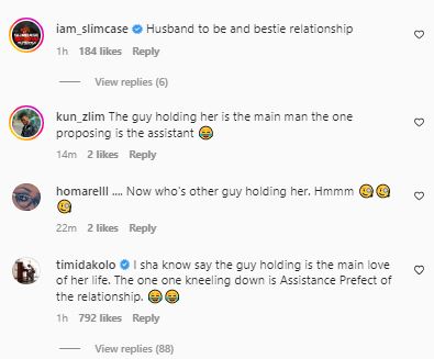 In the video, a man could be seen hugging, and holding the lady while another man knelt on the ground with a ring.
