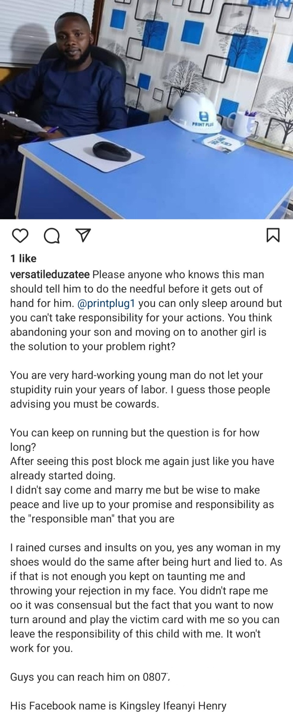 The Instagram user took to her page to post a photo of her son's father while accusing him of shying away from his duties.
