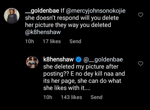 Responding to the question, Kate who seemed unaware that the birthday post was deleted wrote: “She deleted my picture after posting? E no dey kill na and it’s her page, she can do what likes with.”