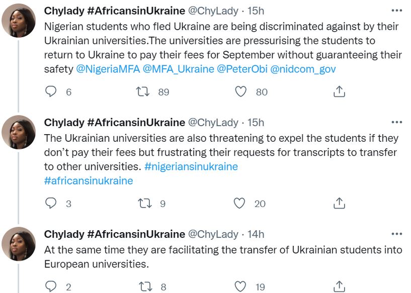 @Chylady revealed that Nigerian students who fled Ukraine are being pressurized to pay their fees for September and return to the country without their safety being guaranteed.