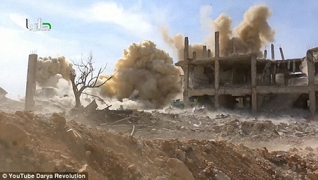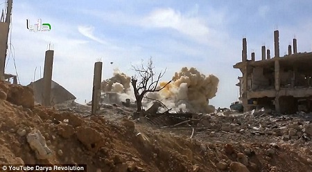 The man then speaks in Arabic, which reports say translates to, ‘God is the greatest. Darya. Barrel bombs on the city. God is the greatest.’ It is not clear whether there were any injuries resulting from the blast.