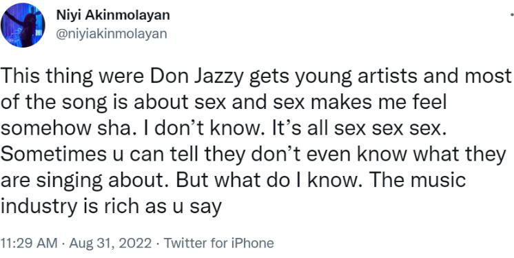 Akinmolayan tweeted; This thing were Don Jazzy gets young artists and most of the song is about s*x and s*x makes me feel somehow sha. I don’t know. It’s all s*x s*x s*x.
