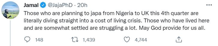 Those who are planning to japa from Nigeria to UK this 4th quarter are literally diving straight into a cost of living crisis. Those who have lived here and are somewhat settled are struggling a lot. May God provide for us all.