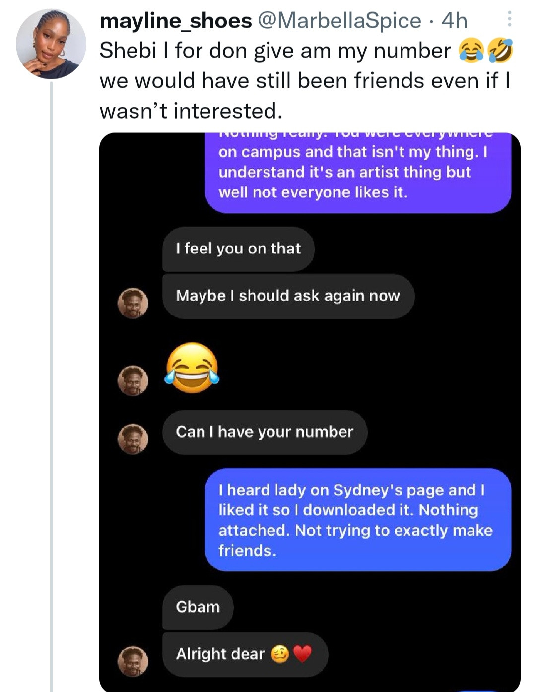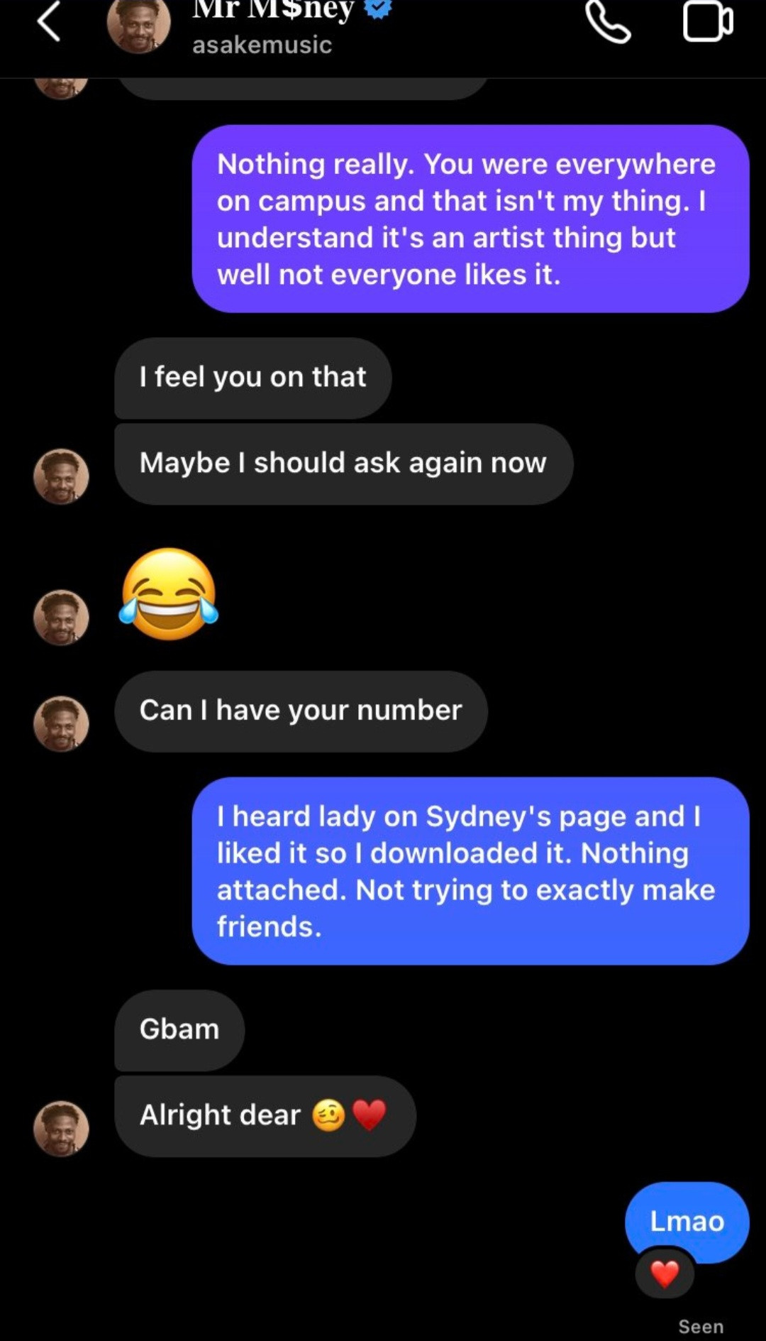 Asake sent the Twitter user a DM in the past, when he wasn't a celebrity. When he asked for her number, she refused to give him.
