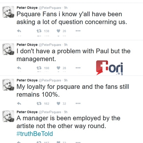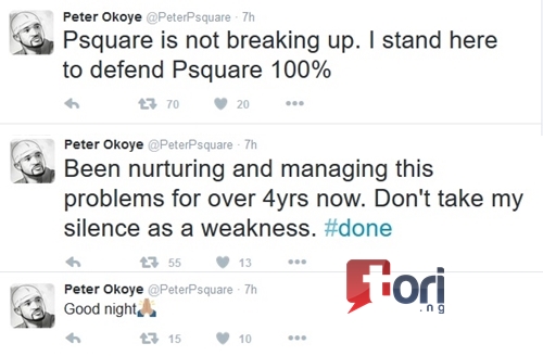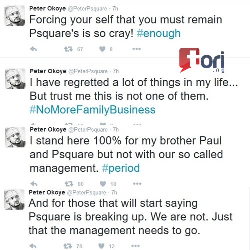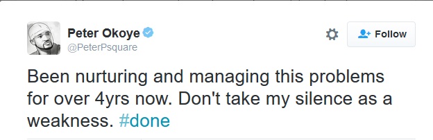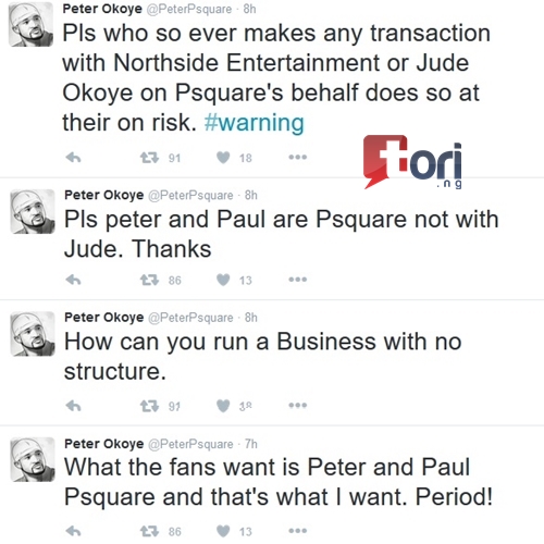 The relationship between the brothers Peter and Jude has been broken down to the extent that the singer tweeted a disclaimer stating that whoever does business with North Side Entertainment on behalf of Psquare is at his or her own risk.
