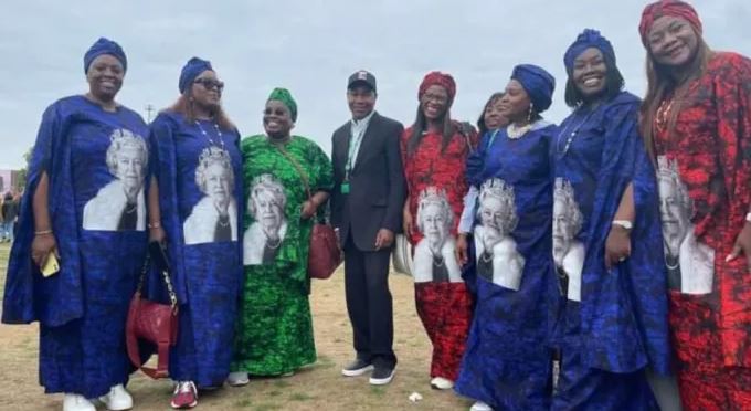 He posted a photo taken with them on Facebook and said, “Nigerian ladies honouring the Queen in their beautiful African aso ebi attires.