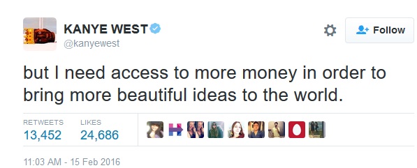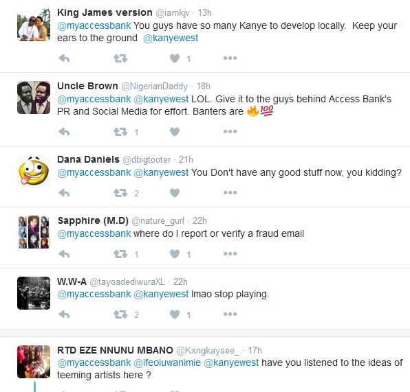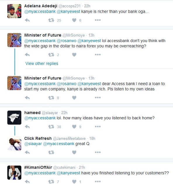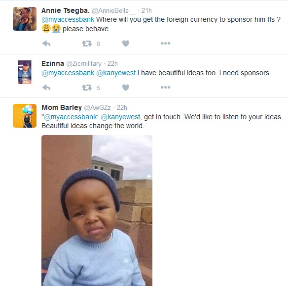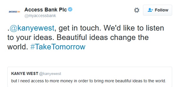 Quoting a tweet by the award winning rapper which said, "But I need access to more money in order to bring more beautiful ideas to the world," Access Bank wrote "@kanyewest, get in touch. We’d like to listen to your ideas. Beautiful ideas change the world. #TakeTomorrow"