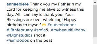 The former beauty queen shared the adorable photo below with her daughter, Sofia and captioned it, "Thank you my Father n my Lord for keeping me alive to witness this day. All I can say is thank you. Your Blessings are over whelming! Happy birthday to myself #queenbanner #18thfebruary #sofia&I #mybeautifulbaby."