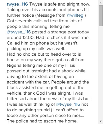reported it here some hours ago that UK-based Nigerian comedian known as Ereme a.k.a Twyse, took to his Instagram to tell his fans that he is about to commit suicide as a result of his frustrations which he can't bear any longer.