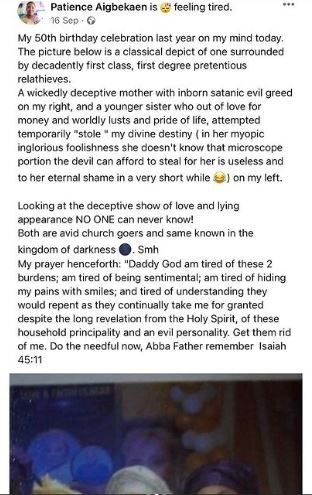 She wrote: “My 50th birthday celebration last year on my mind today. The picture below is a classical depict of one surrounded by decadently first class, first degree pretentious relathieves. A wickedly deceptive mother with inborn satanic evil greed on my right, and a younger sister who out of love for money and worldly lusts and pride of life, attempted temporarily “stole ” my divine destiny ( in her myopic inglorious foolishness she doesn’t know that microscope portion the devil can afford to steal for her is useless and to her eternal shame in a very short while) on my left.