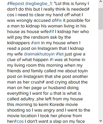 Meanwhile as the news went viral online and social media, Toyin Aimakhu's boyfriend who is a millionaire filmmaker, took to his Instagram to clear the air saying he didn't kidnap her.