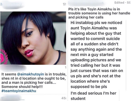 Below is the first mail received: "Hi instablog pls we noticed aunt Toyin Aimakhu was helping about the guy that wanted to commit suicide in the UK, all of a sudden she didn't say anything again and the next min a guy started uploading pictures and we tried calling her but it was just curses that was rained on us pls and she's not at the location where she's supposed to be pls. I'm dead serious I'm her student.