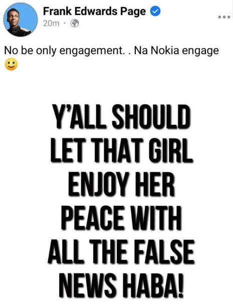 But Frank Edward took to his social media handles on Thursday to debunk the rumour, asking his followers to disregard the fake news.