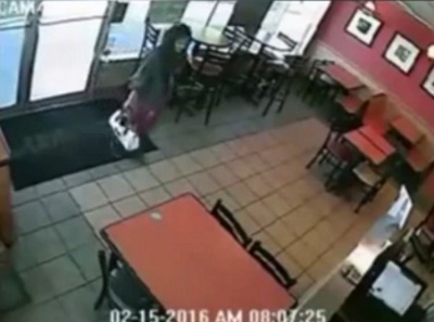They released CCTV footage showing the woman stagger out of the West Covina restaurant after she had been in the toilet for ten minutes.