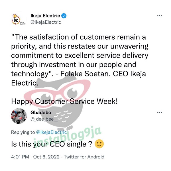 In a tweet made on its verified handle @IkejaElectric, the utility firm, wrote: “The satisfaction of customers remains a priority, and this restates our unwavering commitments to excellent service delivery through investment in our people and technology,” Folake Soetan, CEO, Ikeja Electric.