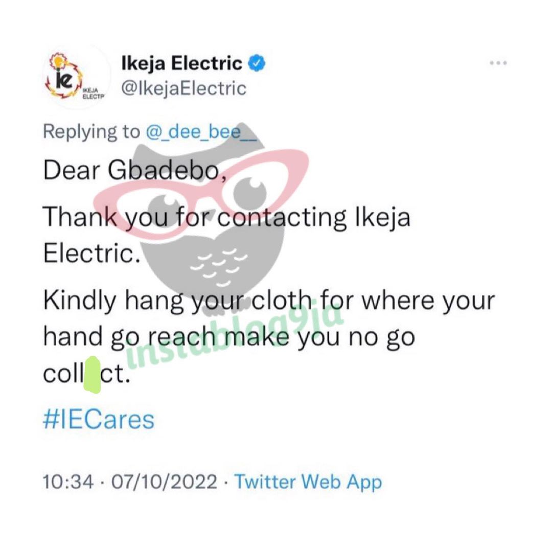 Angered by the question, the company mocked him saying, “Dear Gbadebo, thank you for contacting Ikeja Electric. Kindly, hang your cloth where your hand go reach make you no collect. #ECares.”