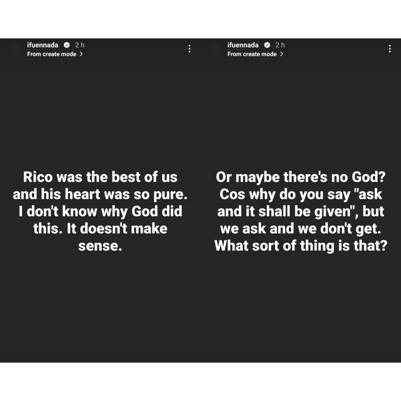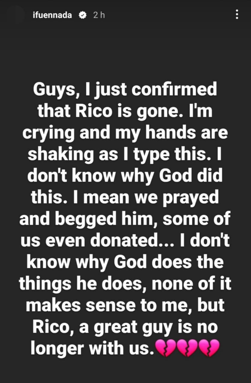 Reality TV star, Ifuennada has reacted to the sad passing of her colleague in the BBNaija house, Rico Swavey.