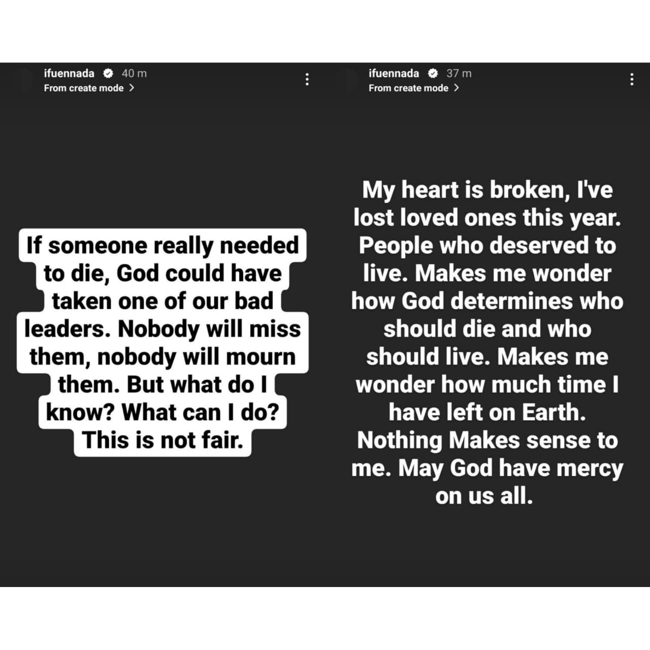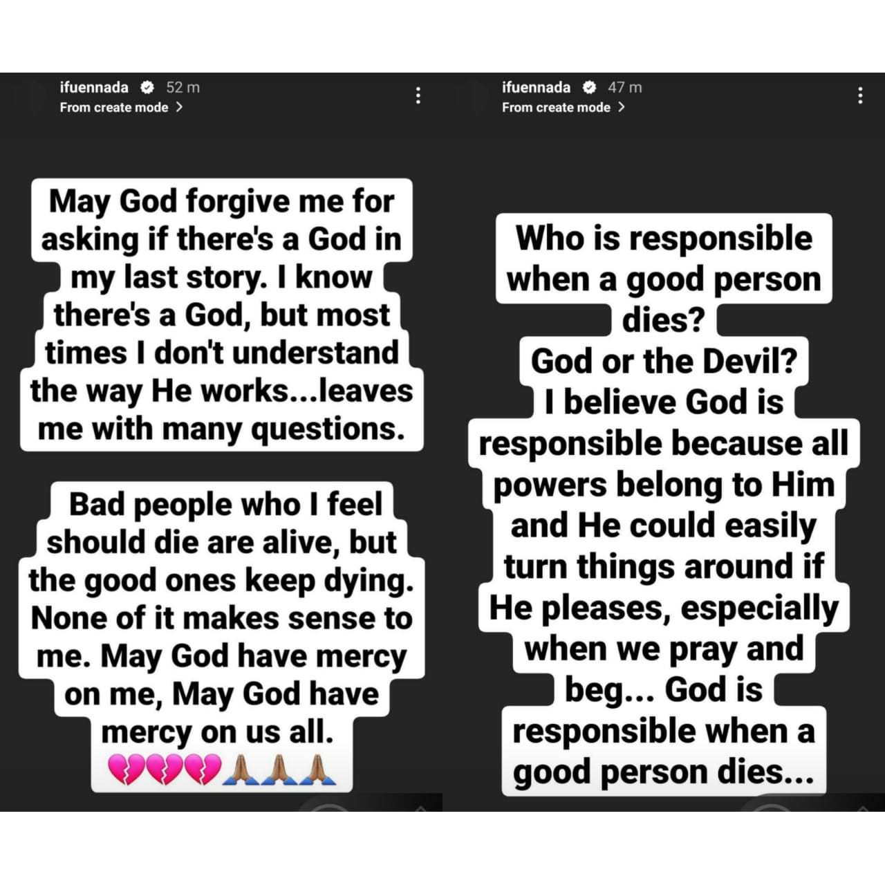 In an emotionally laden post, Ifuennada wondered who is responsible for the death of good people.
